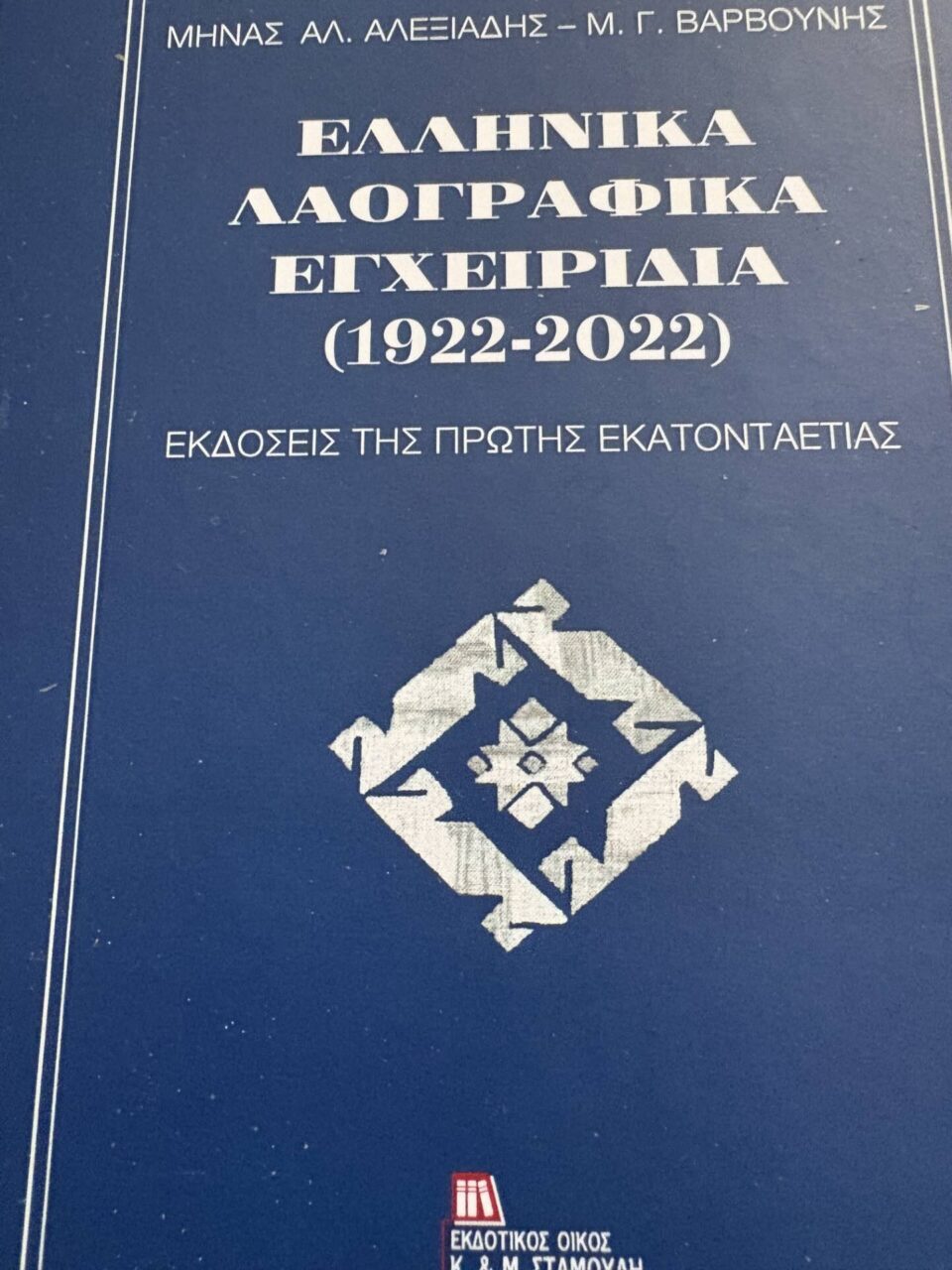 Πρόσφατα κυκλοφορήθηκε από τις εκδόσεις Αντ. Σταμούλη της Θεσσαλονίκης μια σημαντική λαογραφική μελέτη, η οποία πλουτίζει την ελληνική λαογραφική βιβλιογραφία. Πρόκειται για το βιβλίο των Καθηγητών Μηνά Αλ. Αλεξιάδη και Μ. Γ. Βαρβούνη, με τίτλο Ελληνικά λαογραφικά εγχειρίδια (1922 – 2022). Εκδόσεις της πρώτης εκατονταετίας (Θεσσαλονίκη 2025, σσ. 297 – εκδ. οίκος Κ. & Μ. Αντ. Σταμούλη), προϊόν μακροχρόνια έρευνας σχετικά με την ιστορική πορεία και εξέλιξη της Ελληνικής Λαογραφίας.