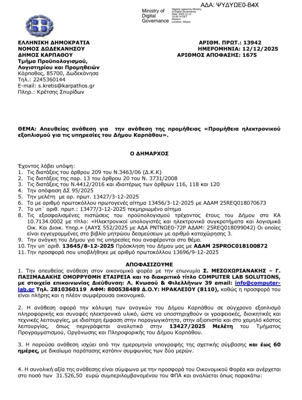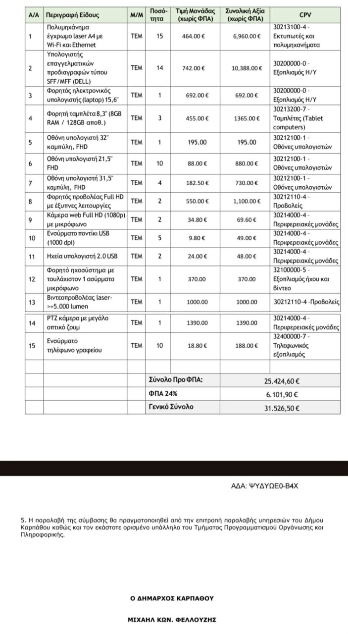 Ο Δήμος Καρπάθου προχώρησε πρόσφατα σε απευθείας ανάθεση προμήθειας ηλεκτρονικού εξοπλισμού, συνολικής αξίας 31.526 ευρώ. Η απόφαση αφορά συγκεκριμένη τεχνική περιγραφή εξοπλισμού και εντάσσεται στο πλαίσιο των προμηθειών που επιτρέπεται να γίνονται χωρίς ανοικτό διαγωνισμό, βάσει των νομικών ορίων.