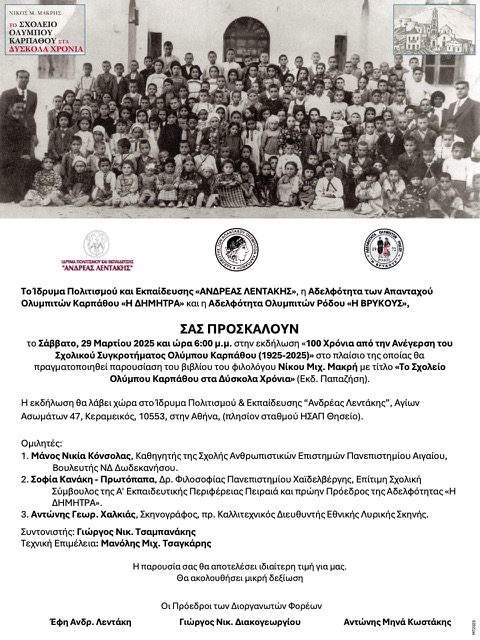 Το Ίδρυμα Πολιτισμού και Εκπαίδευσης «ΑΝΔΡΕΑΣ ΛΕΝΤΑΚΗΣ», η Αδελφότητα των Απανταχού Ολυμπιτών Καρπάθου «Η ΔΗΜΗΤΡΑ» και η Αδελφότητα Ολυμπιτών Ρόδου «Η ΒΡΥΚΟΥΣ» σας προσκαλούν το Σάββατο, 29 Μαρτίου 2025 και ώρα 18.00 μ.μ. στην εκδήλωση για τα 100 χρόνια από την ανέγερση του σχολικού συγκροτήματος Ολύμπου Καρπάθου (1925-2025) στο πλαίσιο της οποίας θα πραγματοποιηθεί η παρουσίαση του βιβλίου του φιλολόγου Νίκου Μιχ. Μακρή με τίτλο «Το Σχολείο Ολύμπου Καρπάθου στα Δύσκολα Χρόνια» (Εκδ. Παπαζήση).