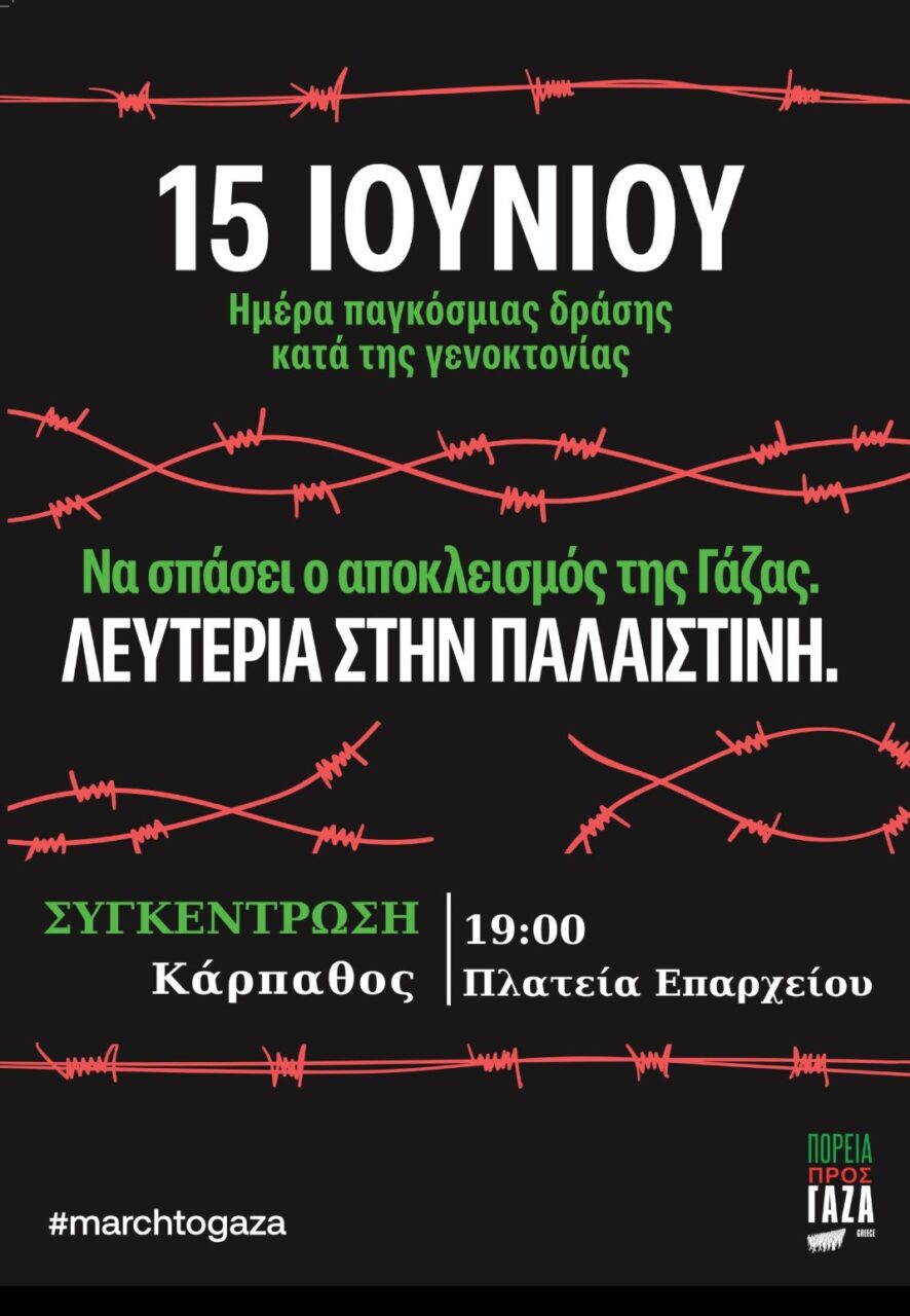 Κάλεσμα αγώνα κατά της γενοκτονίας από την πρωτοβουλία March to Gaza αυτή την Κυριακή 15 Ιουνίου με διαδηλώσεις στο Σύνταγμα και σε πολλές άλλες πόλεις της Ελλάδας και του εξωτερικού και στην ΚΑΡΠΑΘΟ.