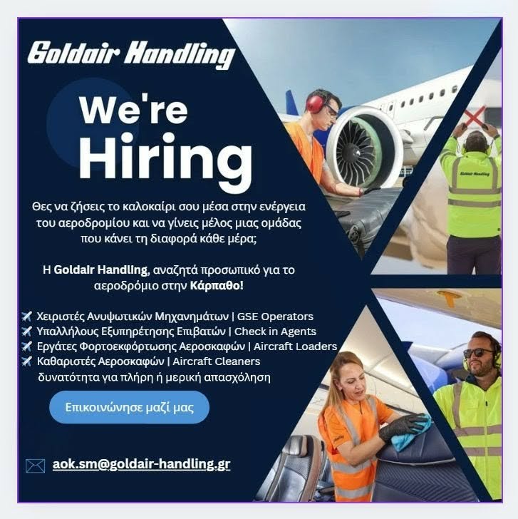 Αγγελίες Εργασίας ΑπόψειςΟ εκτιμώμενος χρόνος ανάγνωσης είναι λιγότερο από ένα λεπτό Η Goldair Handling αναζητά προσωπικό για το αεροδρόμιο της Καρπάθου 265 Views