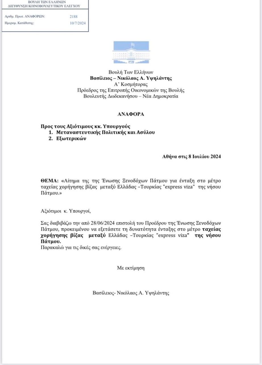“Ευχαριστώ τον Υπουργό Εξωτερικών κ. Γιώργο Γεραπετρίτη για την ανταπόκριση του όχι μόνο να εφαρμοστεί από 1ης Απριλίου η express visa για τους επισκέπτες από Τουρκία σε πολλά νησιά της Δωδεκανήσου αλλά να επεκτείνει το μέτρο και στην Πάτμο. Αίτημα που επανειλημμένα είχα ζητήσει με Κοινοβουλευτικές μου παρεμβάσεις.