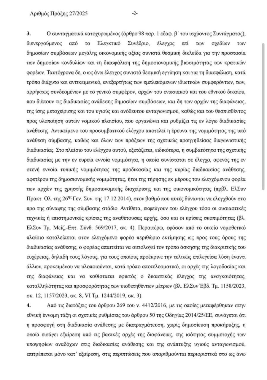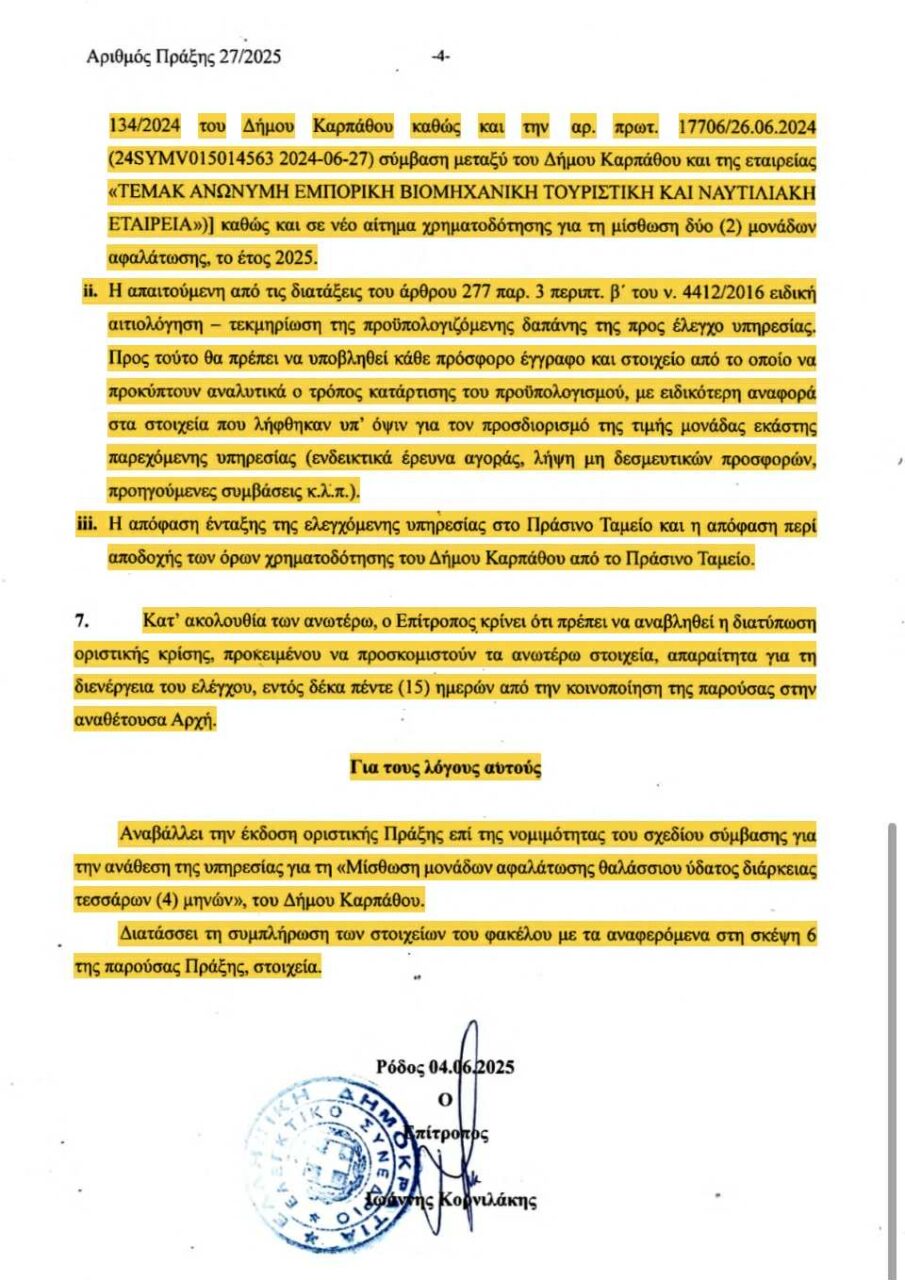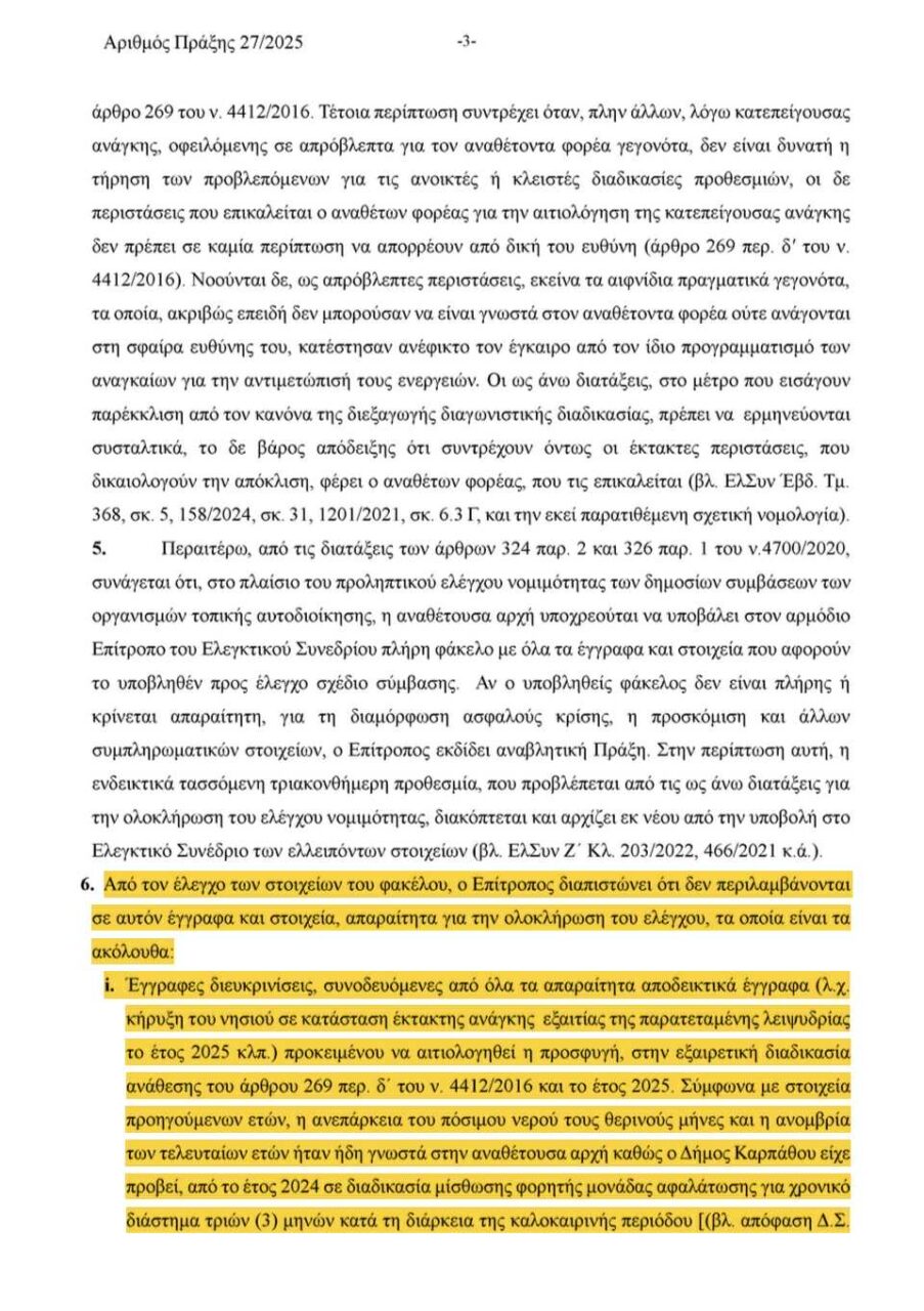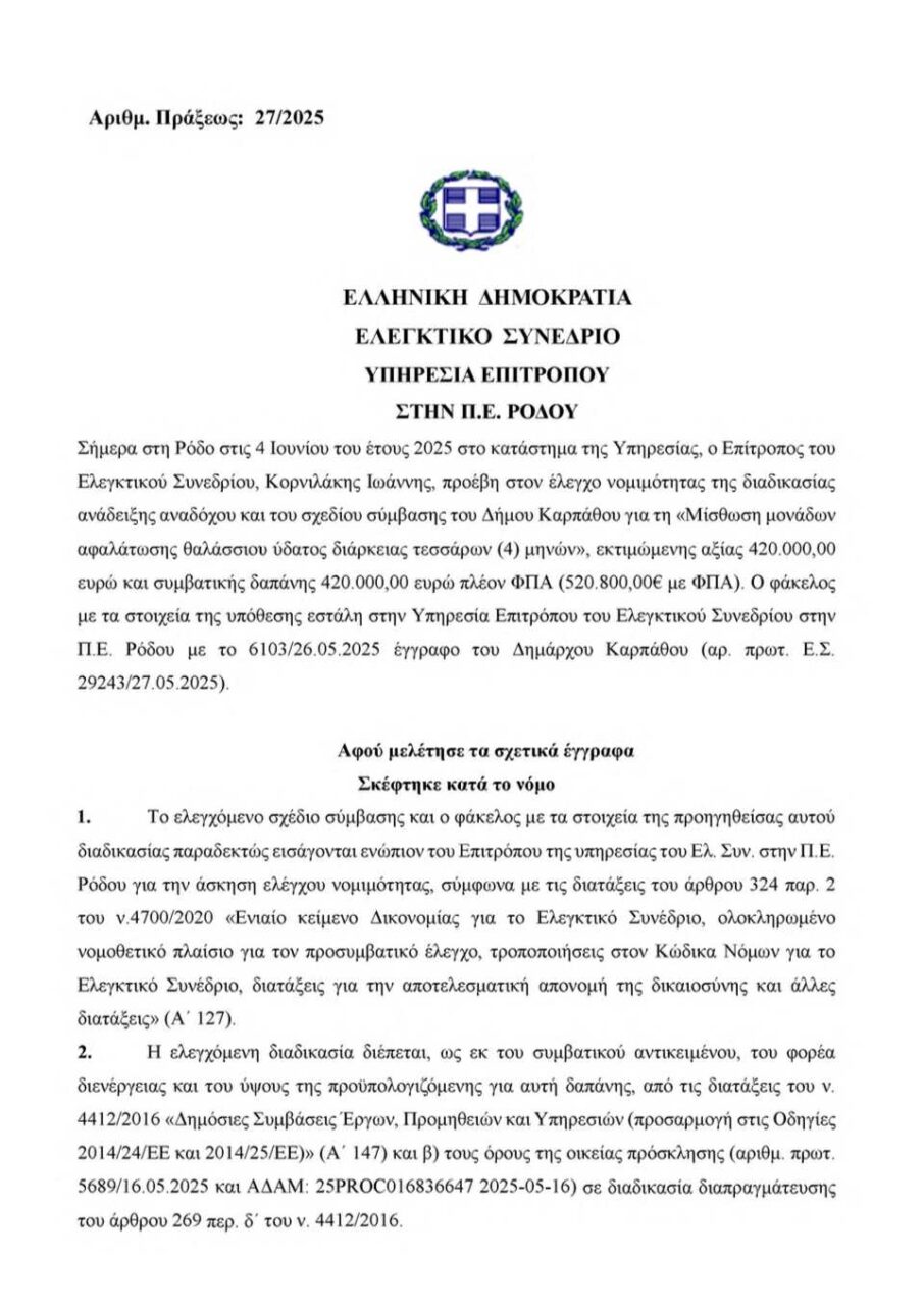 Η Καρπαθιακή Ένωση, πιστή στην αποστολή της σαν Αντιπολίτευση,να υπηρετεί το δημόσιο συμφέρον, δημοσιοποιεί σήμερα την Πράξη 27/2025 του Επιτρόπου του Ελεγκτικού Συνεδρίου (4/7/2025), με την οποία αναστέλλεται ο έλεγχος νομιμότητας της σύμβασης για τη μίσθωση μονάδων αφαλάτωσης στον Δήμο Καρπάθου, λόγω σοβαρών πλημμελειών στον υποβληθέντα φάκελο της Δημοτικής Αρχής. Τι αναφέρει ρητά το Ελεγκτικό Συνέδριο: