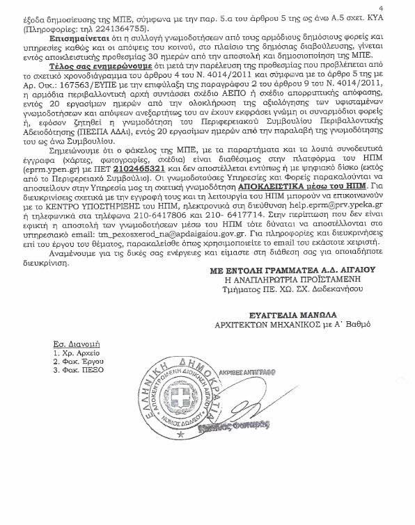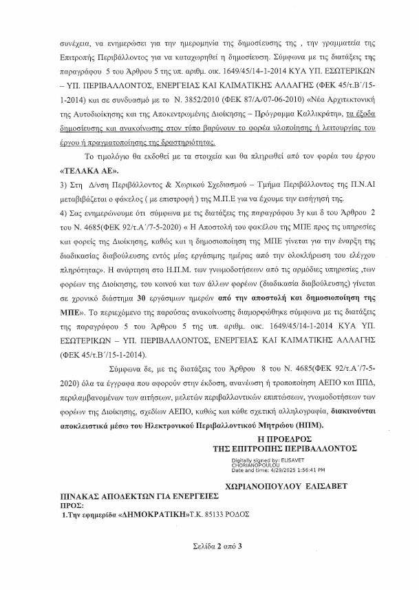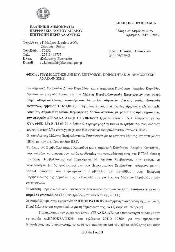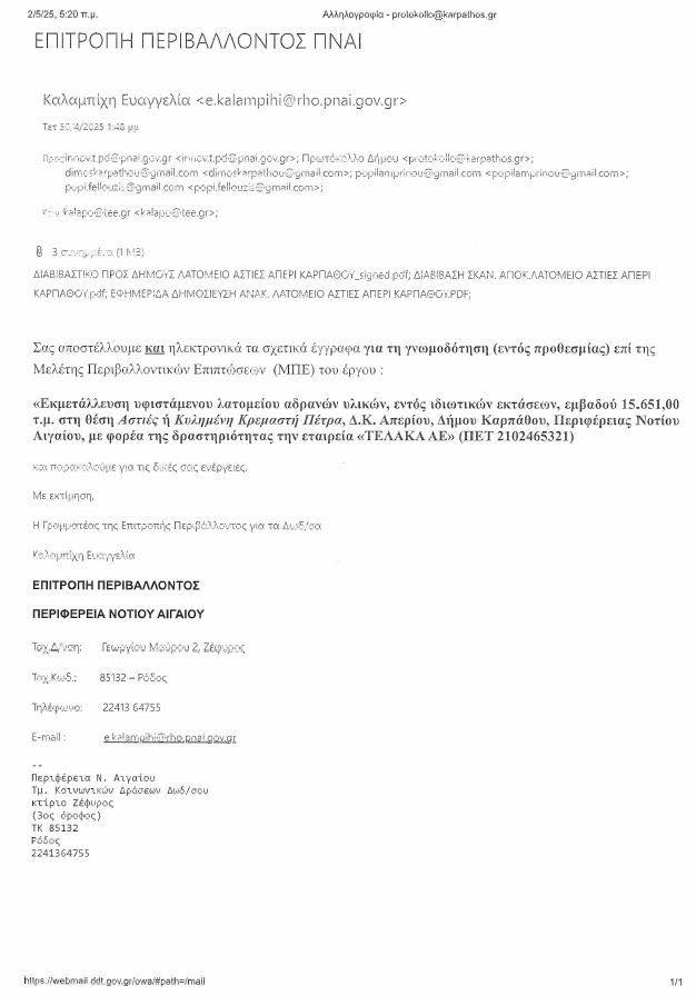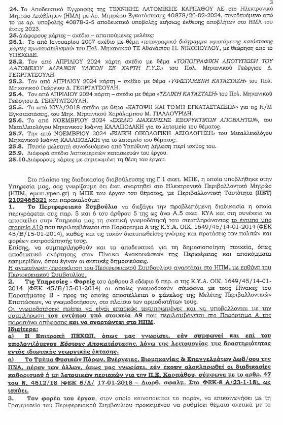Θα θέλαμε να μας εξηγήσετε για ποιον λόγο δεν ενημερωθήκαμε ως μέλη του Δημοτικού Συμβουλίου Καρπάθου και ως πολίτες για το έγγραφο που παραλάβατε στις 29 Απριλίου 2025 και αφορά την έγκριση Μελέτης Περιβαλλοντικών Όρων σχετικά με εκμετάλλευση Λατομείου στο Απέρι.