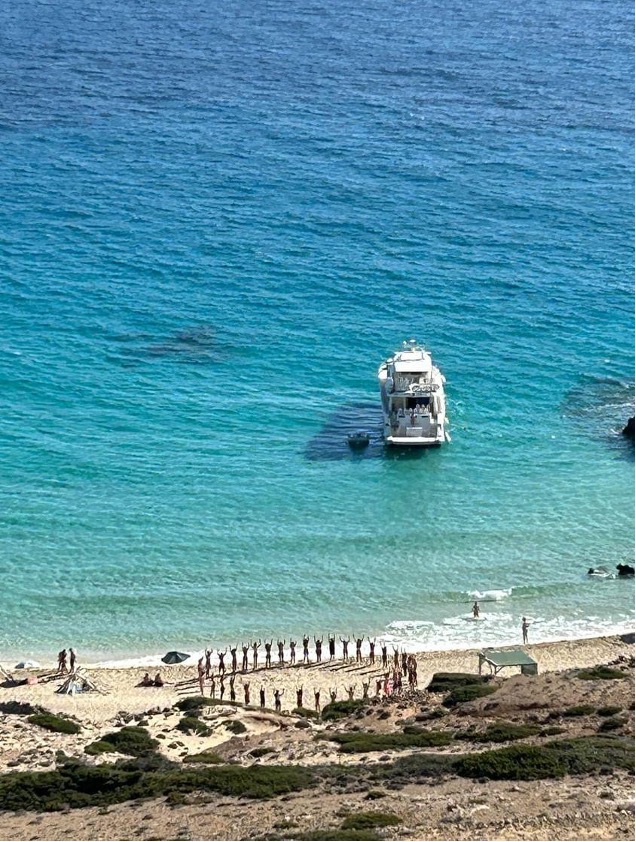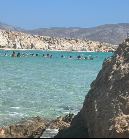 Το τοπίο που μας κόβει την ανάσα με την παρθενική ομορφιά του, δημιουργεί τις προϋποθέσεις για να διασκεδάσουμε με την ψυχή μας απολαμβάνοντας τα πεντακάθαρα νερά. Ακολουθώντας το ρητό νους υγιής σε σώμα υγιές κάναμε ομαδική γυμναστική μες στη θάλασσα!!!