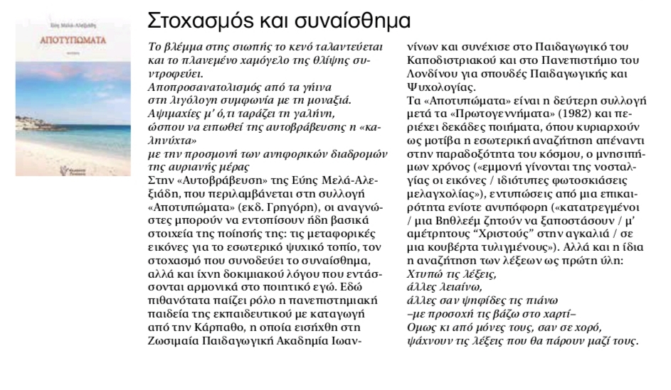 Κριτικό Σημείωμα για το ποιητικό βιβλίο της Εύης Μελά Αλεξιάδη «Αποτυπώματα» από την εφ. ΤΑ ΝΕΑ
