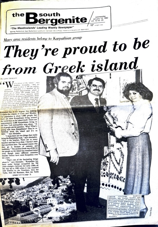 Στις 26 και 27 Δεκεμβρίου 1981 το Meadowlands Stadium στο East Rutherford NJ φιλοξένησε έκθεση της ΚΕΝ με θέμα την Πολιτισμική Κληρονομιά της Καρπάθου. Ο χώρος και η επιμελημένη εργασία ανέβασαν την έκθεση σε υψηλό επίπεδο που ξεπερνούσε τις συνηθισμένες εκδηλώσεις των ομογενειακών συλλόγων. Μια οκτάμηνη καλά οργανωμένη δουλειά στέφθηκε με απόλυτη επιτυχία. O ζήλος, η ακούραστη ευγενική προθυμία και η χαρούμενη διάθεση τους υποδήλωναν τη σεμνή τους περηφάνια για την καταγωγή τους.
