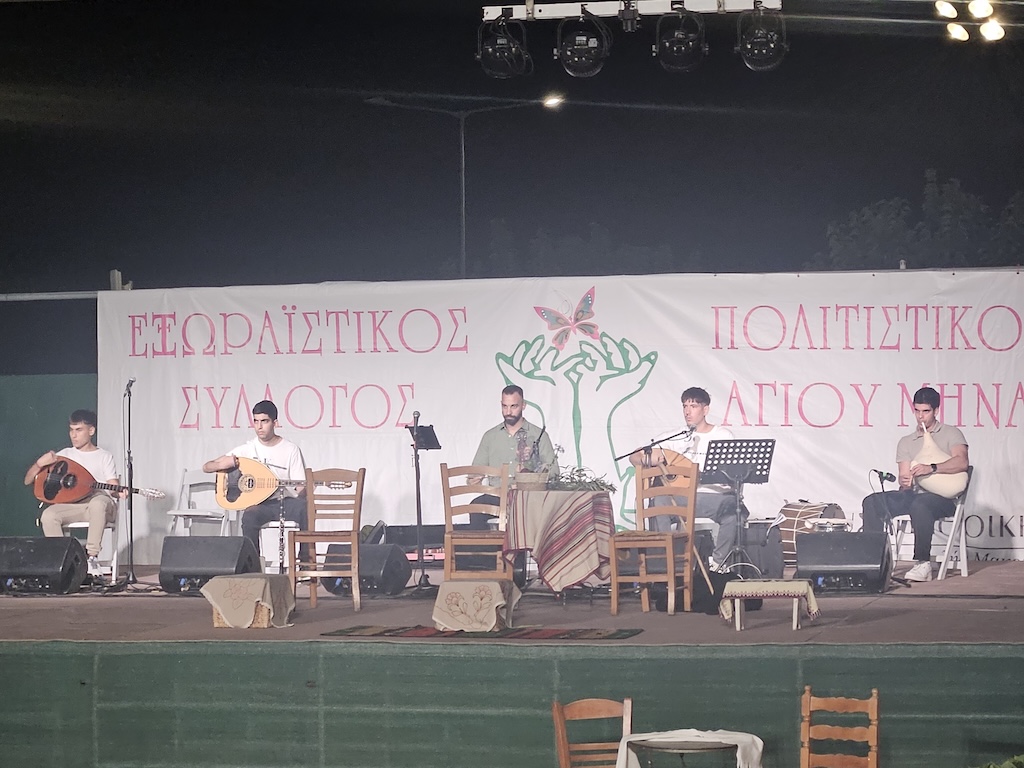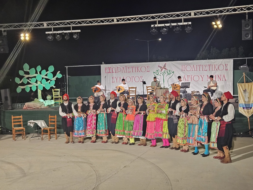 Πριν από την εμφάνιση του χορευτικού της αδελφότητας στην σκηνή του θεάτρου, έγινε αναπαράσταση από τα μέλη της θεατρικής ομάδας του Αγίου Μηνά του καρπάθικου παραμυθιού «Ο πολυροβυθάς», το οποίο είχε καταγράψει ο αείμνηστος ιστορικός και λαογράφος της Καρπάθου Μιχαήλ Μιχαηλίδης Νουάρος, ενώ στο τέλος της εκδήλωσης η πρόεδρος του εξωραϊστικού συλλόγου Κα Πόπη Παπά απένειμε στην Αδελφότητά μας αναμνηστικό δίπλωμα για την παρουσία μας στην καλοκαιρινή τελετή λήξης του σωματείου τους.