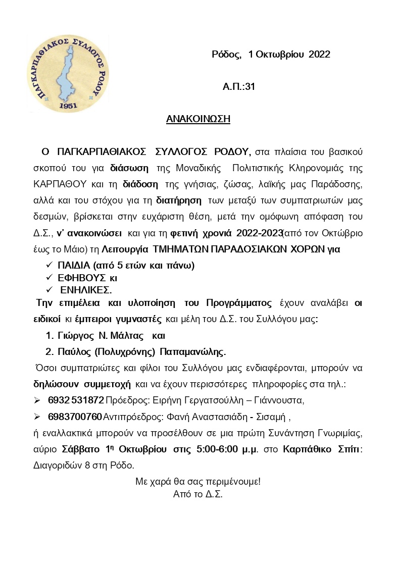 ΠολιτισμόςΟ εκτιμώμενος χρόνος ανάγνωσης είναι λιγότερο από ένα λεπτό Ο Παγκαρπαθιακός Σύλλογος Ρόδου ξεκινά μαθήματα παραδοσιακών χορών 1254 Views (φωτογραφία Αρχείου) 1.10.2022 Καρπαθιακά Νέα
