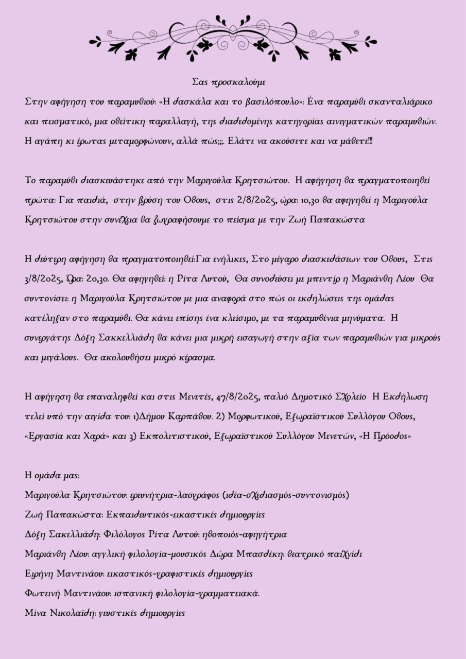 ΠολιτισμόςΟ εκτιμώμενος χρόνος ανάγνωσης είναι λιγότερο από ένα λεπτό Παραμυθούες και Παραμυθιάσματα στην Κάρπαθο! "Η δασκάλα και το βασιλόπουλο" 725 Views 1.8.2025 Καρπαθιακά Νέα