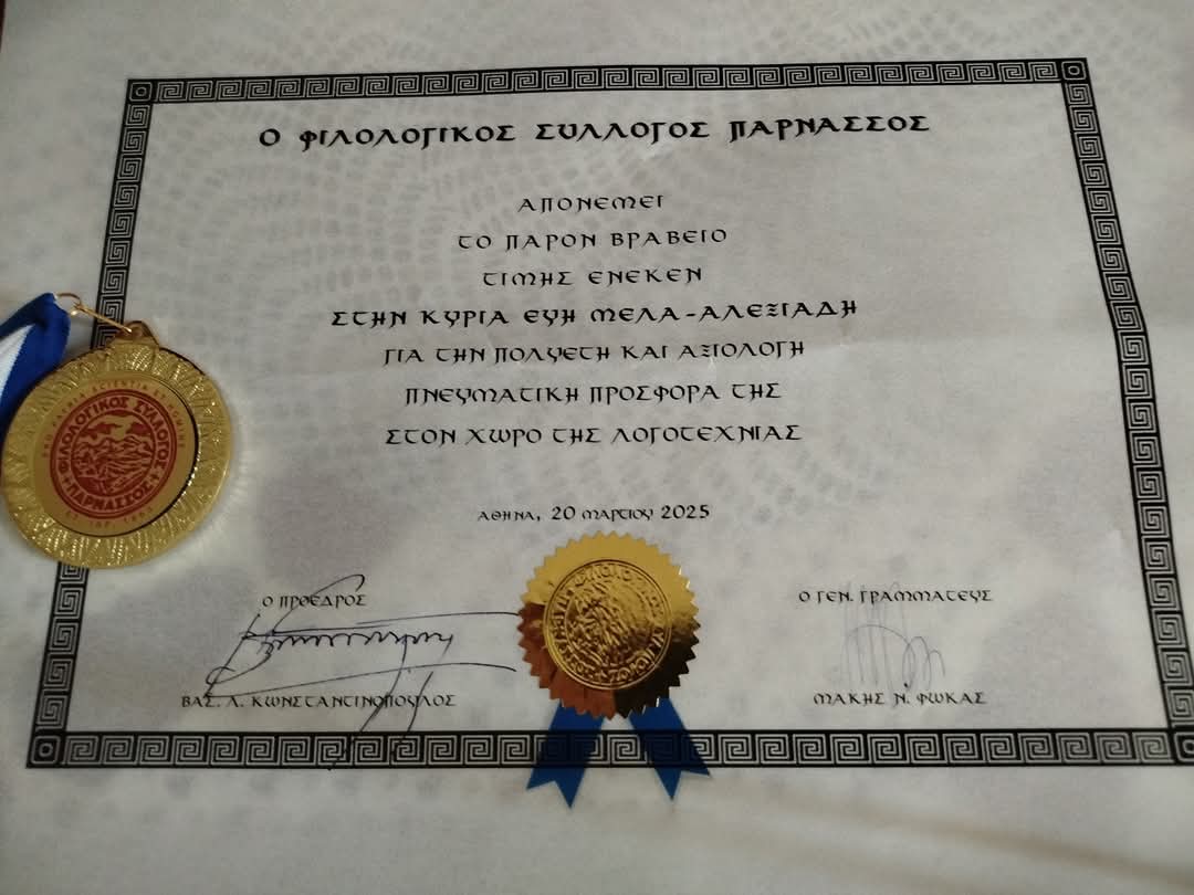Ο Φιλολογικός σύλλογος Παρνασσός βράβευσε την συμπατριώτισσα μας, ποιήτρια Εύη Μελά Αλεξιάδη για το σύνολο του έργου της!