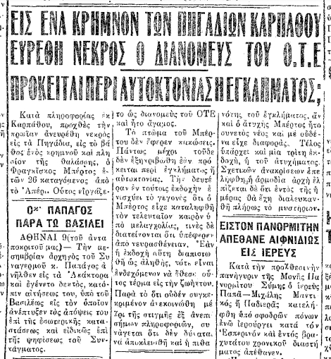 Σαν σήμερα ...Ο εκτιμώμενος χρόνος ανάγνωσης είναι λιγότερο από ένα λεπτό Σαν σήμερα, 10.11.1951, εφ. Πρόοδος: "Νεκρός ο διανομεύς του ΟΤΕ στα Πηγάδια Αυτοκτονία ή Έγκλημα;" 1881 Views