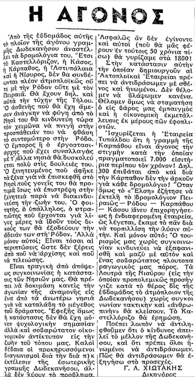 Σαν σήμερα ...Ο εκτιμώμενος χρόνος ανάγνωσης είναι λιγότερο από ένα λεπτό Σαν σήμερα, 25.10.51, εφ. Ροδιακή, "Η ΑΓΟΝΟΣ", του Γ. Λ. Χιωτάκη 845 Views