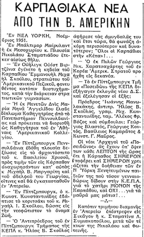 Απόδημοι Σαν σήμερα ...Ο εκτιμώμενος χρόνος ανάγνωσης είναι λιγότερο από ένα λεπτό Σαν σήμερα, 12.11.51, εφ. Ροδιακή "Καρπαθιακά Νέα από την Β. Αμερικήν" 606 Views