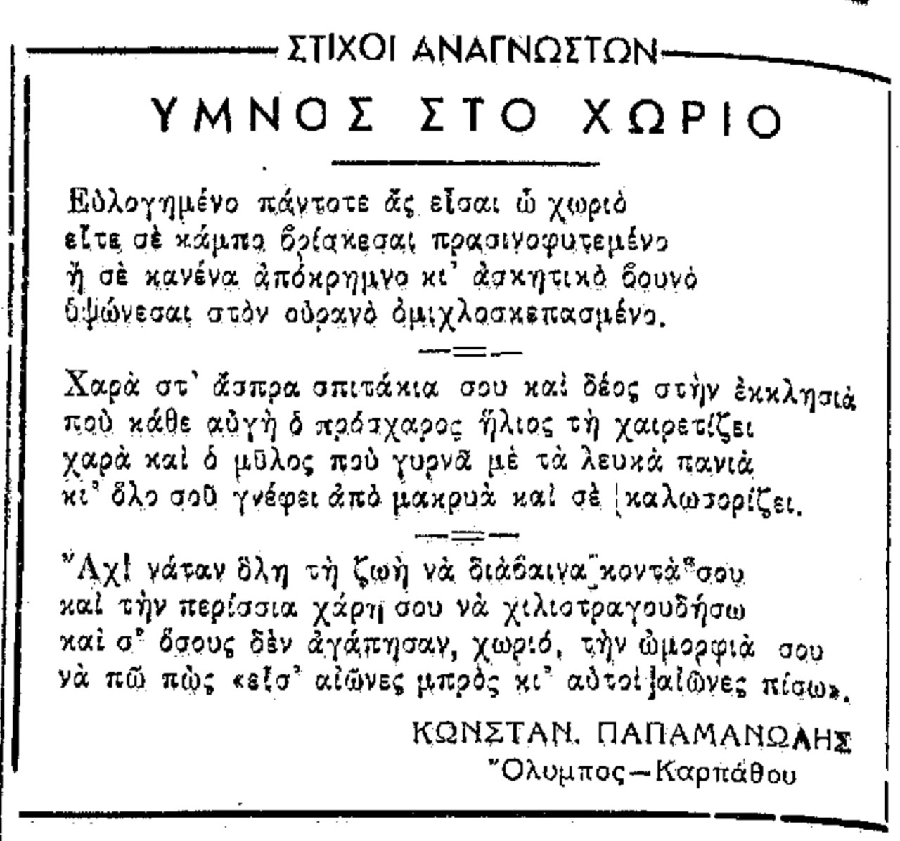 Σαν σήμερα ...Ο εκτιμώμενος χρόνος ανάγνωσης είναι λιγότερο από ένα λεπτό Σαν σήμερα, 15.10.50, εφ. Πρόοδος: "Ύμνος στο χωριό" του Κωνστ. Παπαμανώλη Όλυμπος Καρπάθου 873 Views