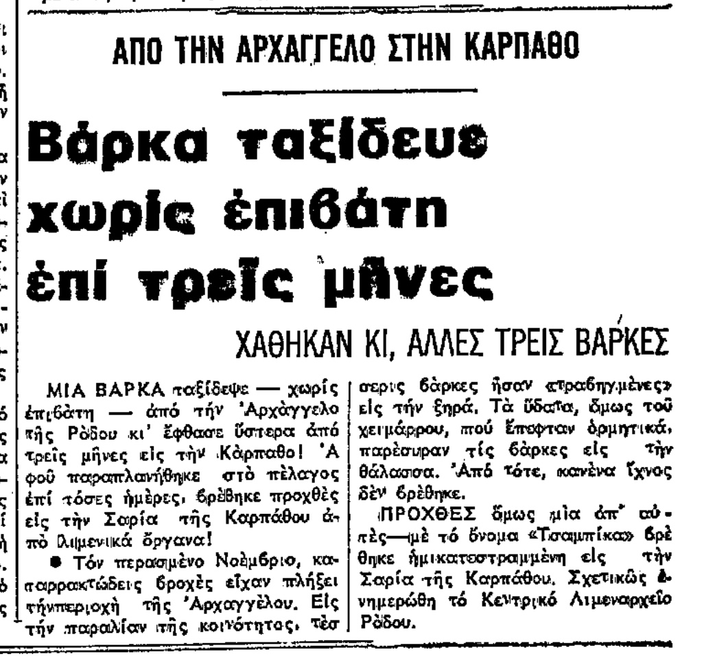 Σαν σήμερα ...Ο εκτιμώμενος χρόνος ανάγνωσης είναι λιγότερο από ένα λεπτό Σαν σήμερα, 16.1.1970, εφ. Πρόοδος: Βάρκα ταξίδευε χωρίς επιβάτη 3 μήνες κι έφτασε στην Κάρπαθο! 1517 Views