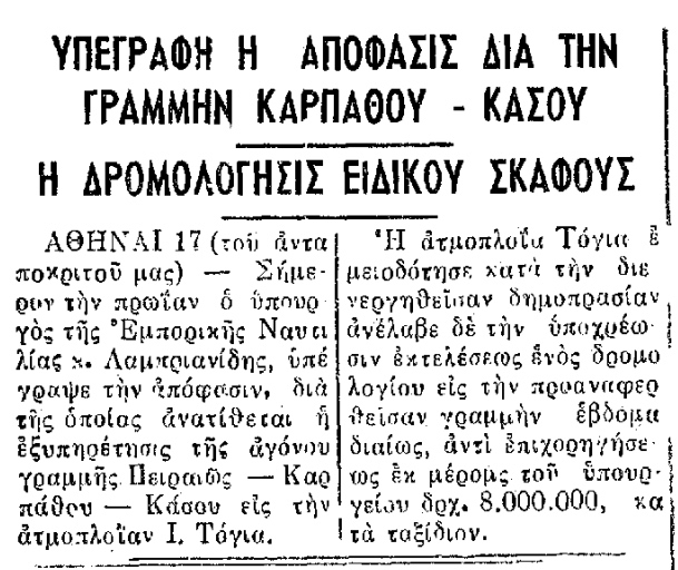 Σαν σήμερα ...Ο εκτιμώμενος χρόνος ανάγνωσης είναι λιγότερο από ένα λεπτό Σαν σήμερα, 18.12.52, εφ. Πρόοδος "Υπεγράφη η απόφαση δια την γραμμήν Καρπάθου-Κάσου" 442 Views