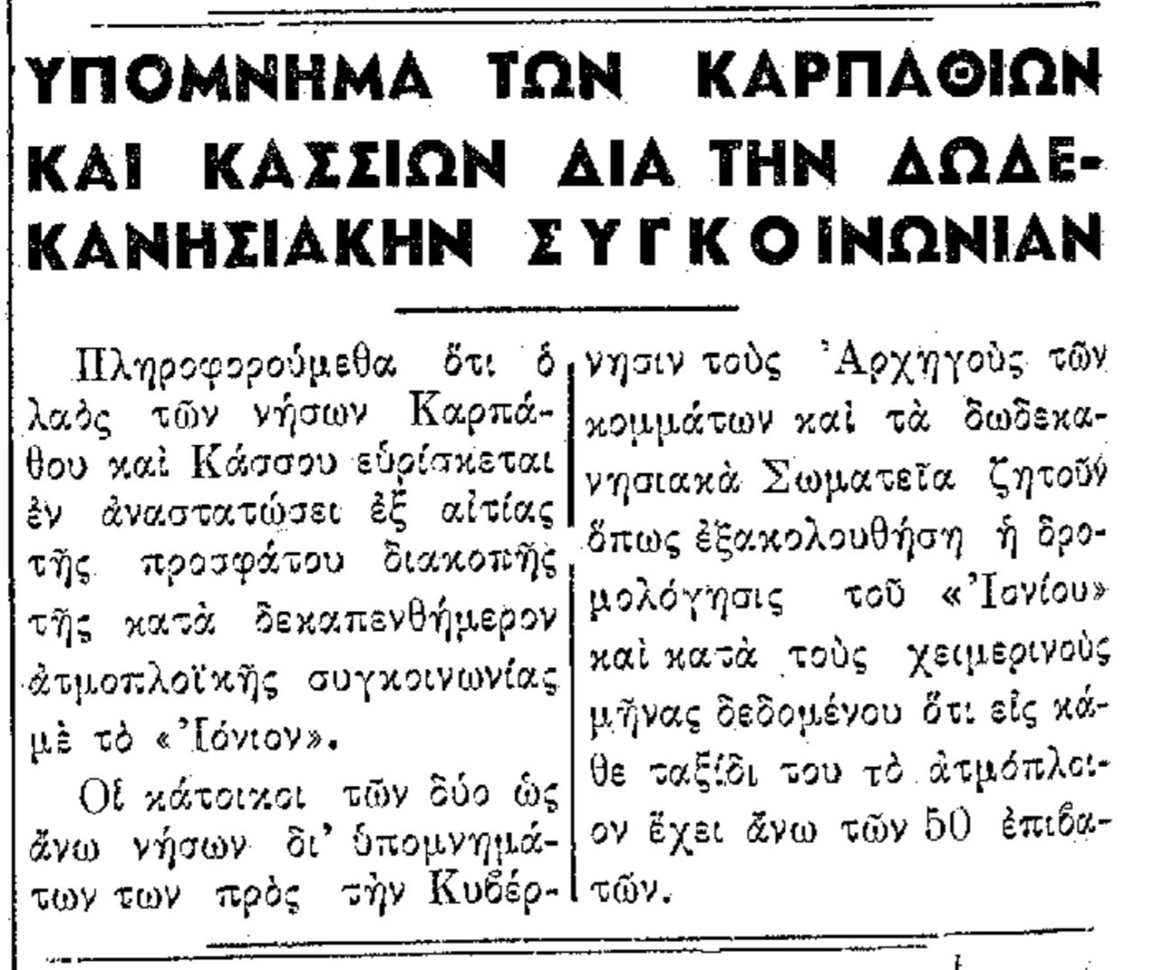 Σαν σήμερα ...Ο εκτιμώμενος χρόνος ανάγνωσης είναι λιγότερο από ένα λεπτό Σαν σήμερα 19.10.49 Πρόοδος "Υπομνημα των Καρπαθίων και Κασίων για τη Δωδεκανησιακή συγκοινωνία" 512 Views
