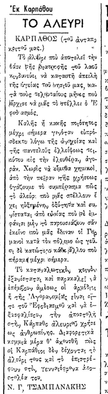 Σαν σήμερα ...Ο εκτιμώμενος χρόνος ανάγνωσης είναι λιγότερο από ένα λεπτό Σαν σήμερα, 2.8.49, εφ. Ροδιακή: "Το αλεύρι" γράφει ο Ν. Γ. Τσαμπανάκης 1059 Views