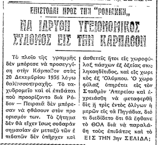 Σαν σήμερα ...Ο εκτιμώμενος χρόνος ανάγνωσης είναι λιγότερο από ένα λεπτό Σαν σήμερα, 20.1.1957, εφ. Ροδιακή: Ο Γ. Χιωτάκης προτείνει την ίδρυση Υγειονομικού Σταθμού στην Κάρπαθο 1167 Views