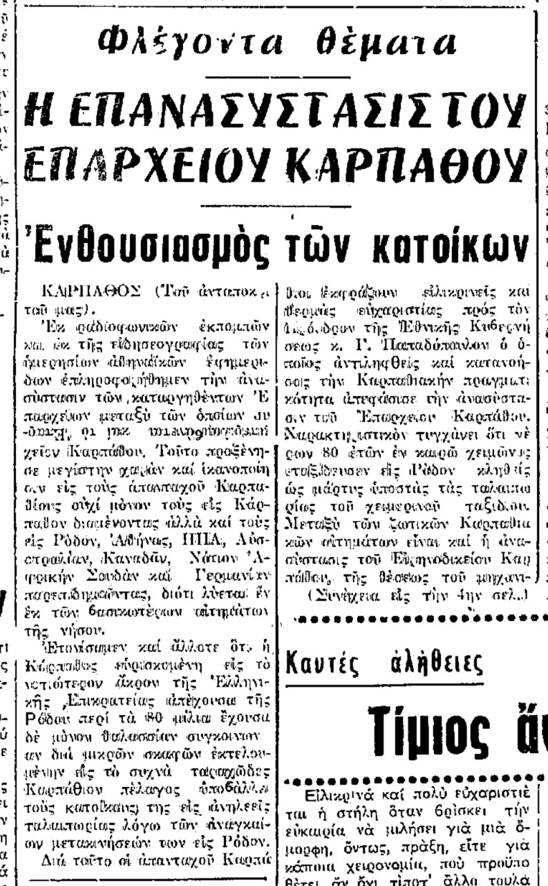 Σαν σήμερα ...Ο εκτιμώμενος χρόνος ανάγνωσης είναι λιγότερο από ένα λεπτό Σαν σήμερα 22.4.1972, εφ. Πρόοδος: "Η επανασύστασις του Επαρχείου Καρπάθου" 1329 Views