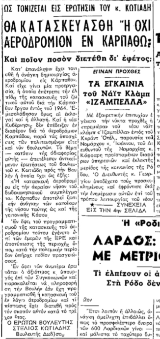 Σαν σήμερα ...Ο εκτιμώμενος χρόνος ανάγνωσης είναι λιγότερο από ένα λεπτό Σαν σήμερα, 25.4.1964, εφ. Ροδιακή: "Θα κατασκευασθή ή Όχι αεροδρόμιο εν Καρπάθω;" 1488 Views