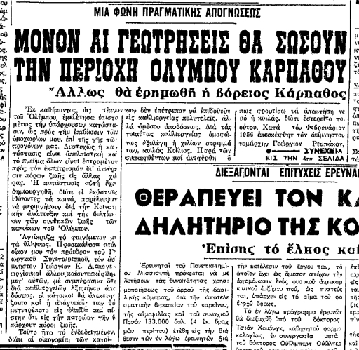 Σαν σήμερα ...Ο εκτιμώμενος χρόνος ανάγνωσης είναι λιγότερο από ένα λεπτό Σαν σήμερα, 28.9.67, εφ. Πρόοδος: "Μόνον αι γεωτρήσεις θα σώσουν την περιοχη Ολύμπου Καρπάθου" 740 Views