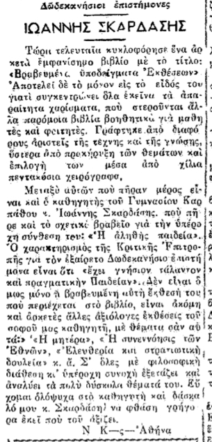 Σαν σήμερα ...Ο εκτιμώμενος χρόνος ανάγνωσης είναι λιγότερο από ένα λεπτό Σαν σήμερα, 6.3.1953, εφ. Πρόοδος: "Ιωάννης Σκαρδάσης. Ο βραβευμένος καθηγητής του Γυμνασίου Καρπάθου" 3212 Views