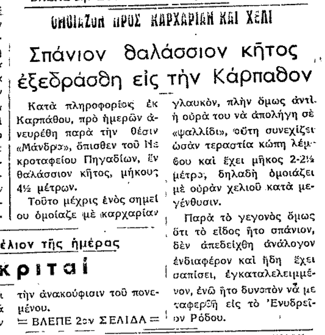 Σαν σήμερα ...Ο εκτιμώμενος χρόνος ανάγνωσης είναι λιγότερο από ένα λεπτό Σαν σήμερα, 9.12.56, εφ. Ροδιακή: Σπάνιο θαλάσσιο κήτος ξεβράστηκε στην Κάρπαθο! 1512 Views