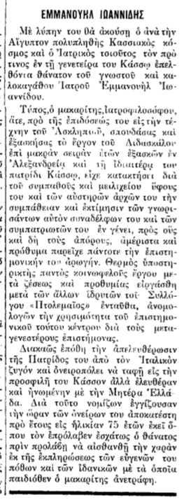Σαν σήμερα ...Ο εκτιμώμενος χρόνος ανάγνωσης είναι λιγότερο από ένα λεπτό Σαν σήμερα, 9.4.1927, εφ. Δωδεκάνησος - Νεκρολογία: Ο Κασιώτης ιατρός Εμμανουήλ Ιωαννίδης 551 Views