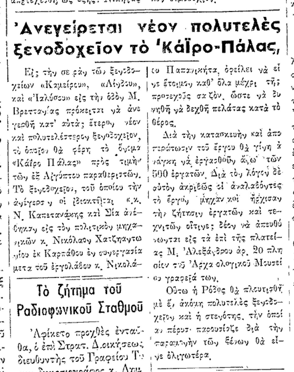 Σαν σήμερα ...Ο εκτιμώμενος χρόνος ανάγνωσης είναι λιγότερο από ένα λεπτό Σαν σήμερα, 6.2.1950, εφ. Ροδιακή: "Νέο πολυτελές ξενοδοχείο ΚΑΙΡΟ ΠΑΛΑΣ" 1123 Views