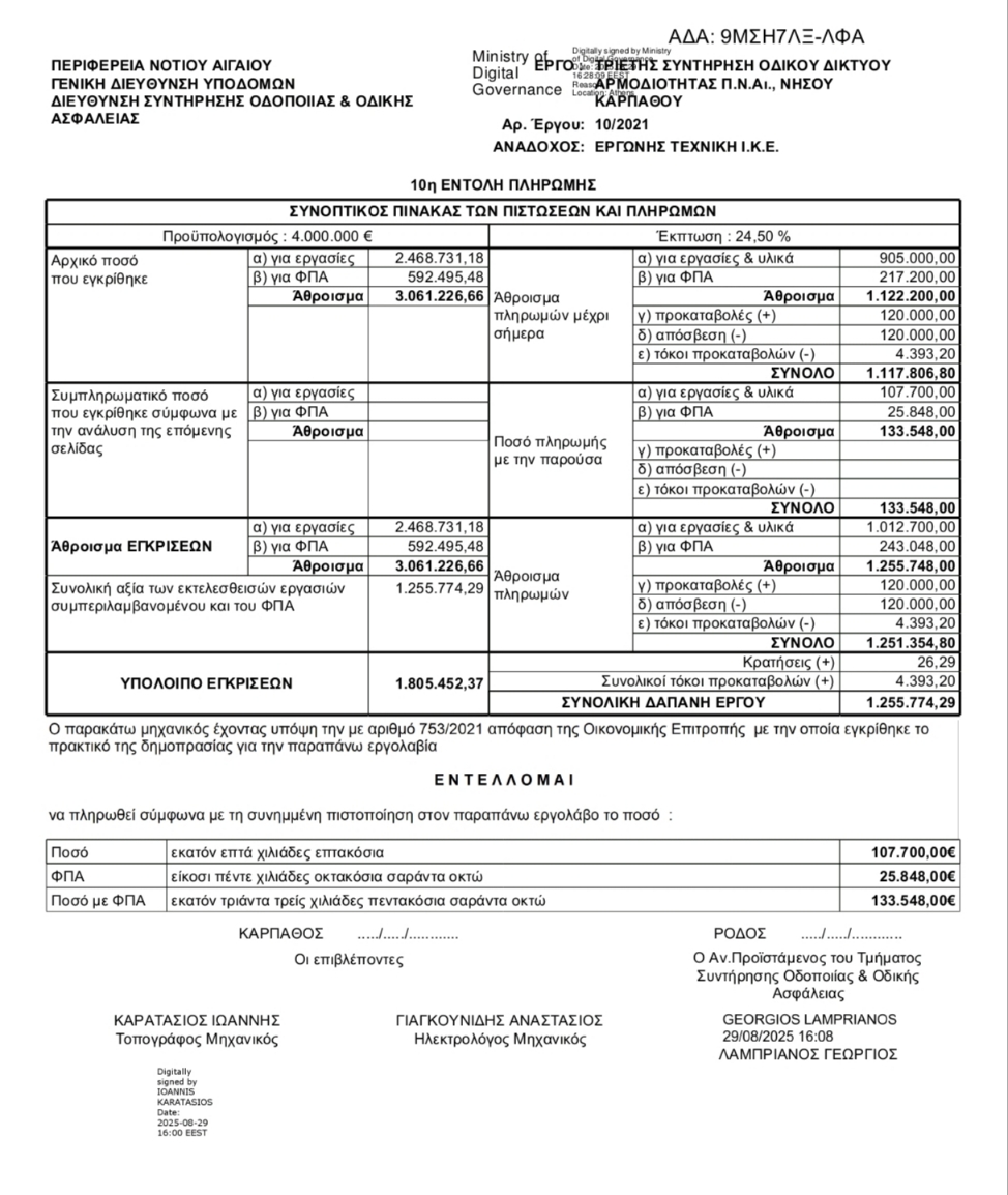 Σύμφωνα με το έγγραφο από τη Διαύγεια μετά από πέντε χρόνια έχει απορροφηθεί το 40% τον διαθέσιμων χρημάτων για το Επαρχιακό δίκτυο του νησιού .