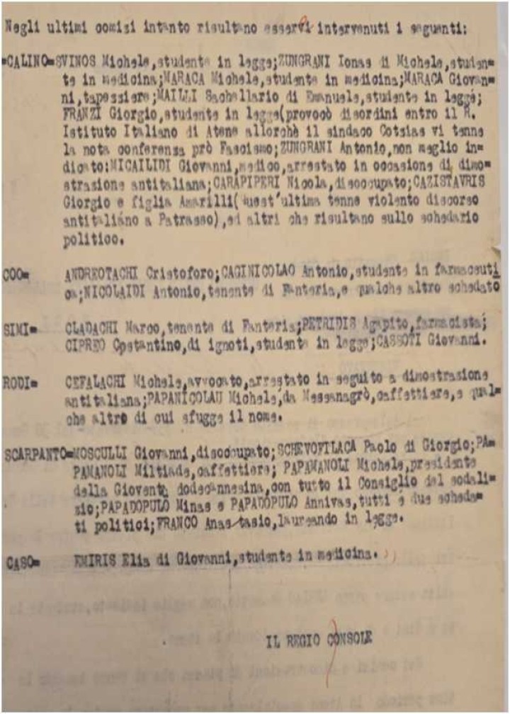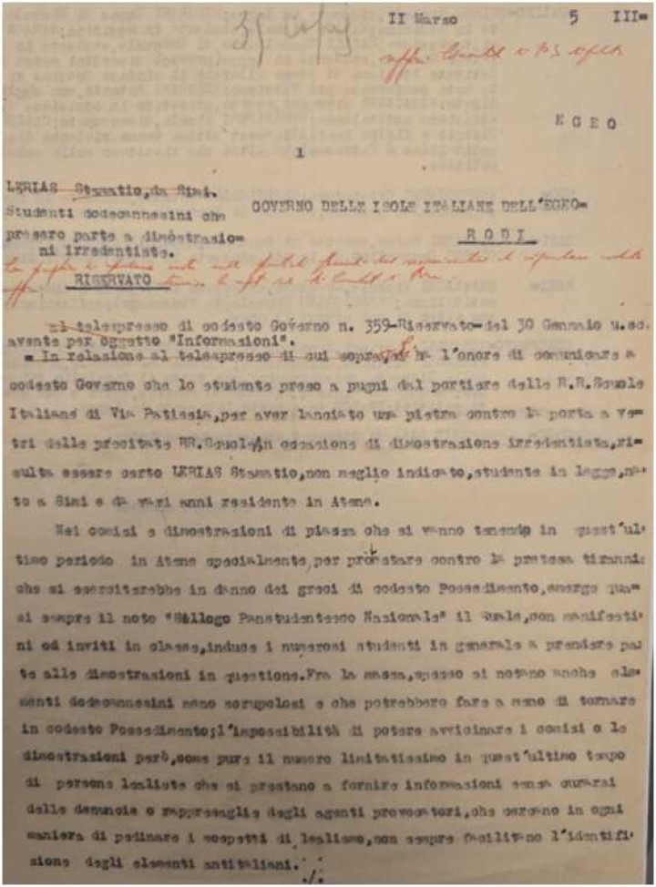 Με το τηλεγράφημα του παρόντος Κυβερνήσεως υπ’ αριθ. 359 – Απόρρητο – της 30ής Ιανουαρίου τ.έ., σας γνωστοποιήθηκε, για ενημέρωσή σας, ότι σε σχέση με το τηλεγράφημα που σας απεστάλη προηγουμένως προς τιμήν συνδρομής, το παρόν Κυβερνείο πληροφορήθηκε ότι ο φοιτητής που συνελήφθη από τον θυρωρό της Βασιλικής Ιταλικής Σχολής της οδού Πατησίων, επειδή εκτόξευσε μία πέτρα κατά της εισόδου κατά τη διάρκεια των προαναφερθεισών αυστηρά αντιφασιστικών εκδηλώσεων, αποδείχθηκε ότι είναι ο Λεριάς Σταμάτιος , άλλως μη καλώς κατονομαζόμενος, φοιτητής Νομικής, γεννημένος στη Σύμη και επί σειρά ετών κάτοικος Αθηνών.