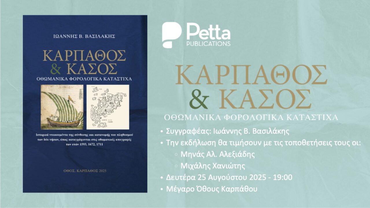 Στις 25 Αυγούστου, στο χωριό καταγωγής του συγγραφέα, το Όθος, θα παρουσιαστεί στο κοινό το νέο έργο του Ιωάννη Β. Βασιλάκη με τίτλο «Κάρπαθος & Κάσος – Οθωμανικά Φορολογικά Κατάστιχα». Η εκδήλωση διοργανώνεται από τον Σύλλογο «Εργασία και Χαρά» και αποτελεί μια από τις σπουδαιότερες στιγμές για την τοπική ιστορία και μνήμη.