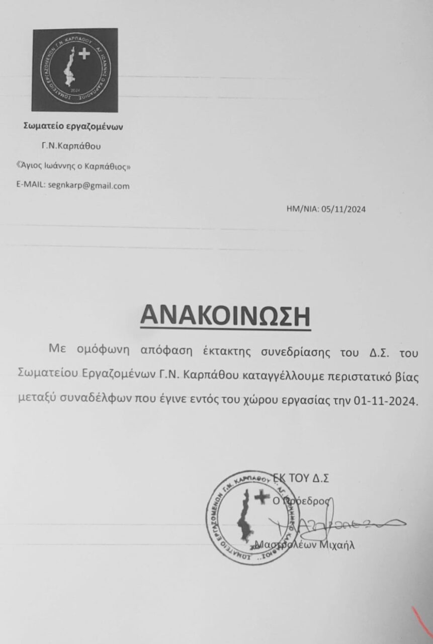 ΕπικαιρότηταΟ εκτιμώμενος χρόνος ανάγνωσης είναι λιγότερο από ένα λεπτό Περιστατικό βίας καταγγέλνει το Σωματείο Εργαζομένων του Νοσοκομείου Καρπάθου 1526 Views 13.11.2024 Καρπαθιακά Νέα